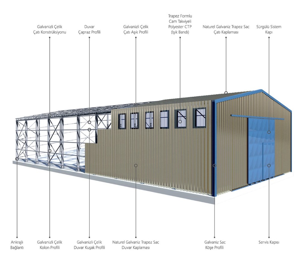- Çelik konstrüksiyonlu olan endüstriyel yapılar